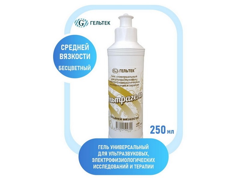 Гель универсальный для ультразвуковых, электрофизиологических исследований и терапии «Ультрагель» средней вязкости не содержит в составе солей, контактирует с ультразвуковыми датчиками, электродами, не оказывая на них негативного воздействия. Гель показан к применению в качестве контактной среды для проведения ультразвуковых и электрофизиологических исследований, терапии, фото- и лазерной косметологии. Гель применяется для всех ультразвуковых процедур (например, ультразвуковой диагностики, эхокардиографии и т.п.) и электрофизиологических процедур (ЭКГ, ЭЭГ, РЭГ). Гель универсальный для ультразвуковых, электрофизиологических исследований и терапии «Ультрагель» средней вязкости служит эффективной контактной средой исследований при использовании отечественной или импортной аппаратуры. Гель наносится непосредственно на датчик, либо тело пациента, легко распределяется и не растекается по коже, долго не сохнет, обеспечивая длительное скольжение и полный контакт датчика с телом пациента. После проведения исследования гель легко удаляется салфеткой или смывается водой. Гель не пачкает одежду, не вызывает аллергии, не портит датчики, водорастворимый. Вязкость: 18 – 23 Па•с (Брукфильд RVDVII+Pro/SC4-29/30 об/мин., скорость сдвига (7,5±0,1)•с, при 23ºС), pH:6,0-8,0 Удельная электрическая проводимость: 0,3 - 0,4 См/м 1,52•10 кг/м2•с
