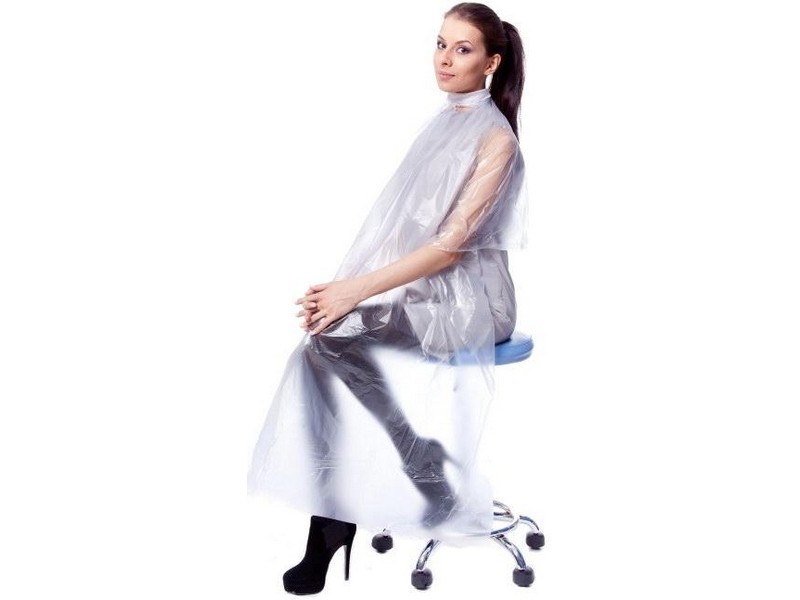 Одноразовые пеньюары из полиэтилена препятствуют попаданию воды, краски, лаков или других косметических веществ на одежду клиентов. Используются во время стрижек, окрашивания или химической завивки волос.