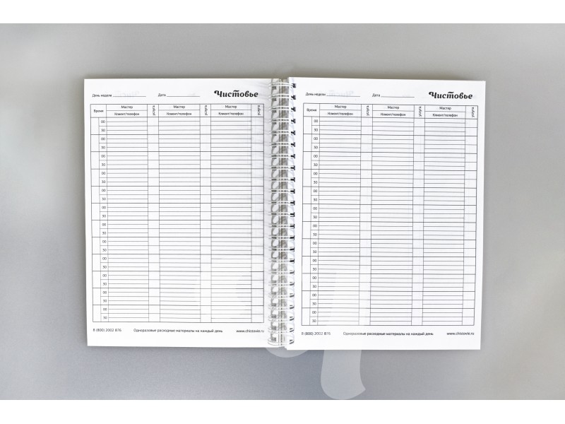 Книга для записи клиентов является главным элементом работы администратора салона красоты или парикмахерской, она позволяет спланировать время работы мастеров и загрузки заведения. В книге 188 страниц, формата A4. В конце размещен разворот для пометок важных дат постоянных клиентов.